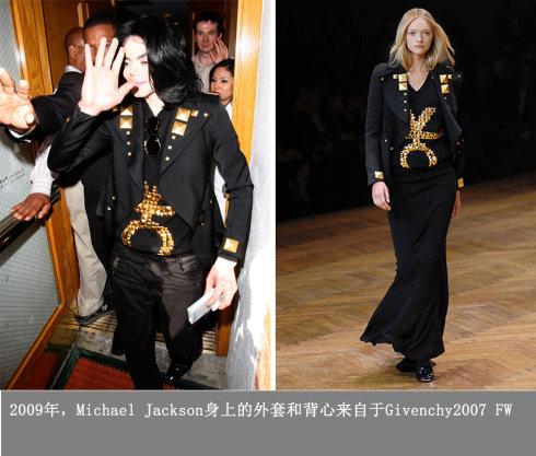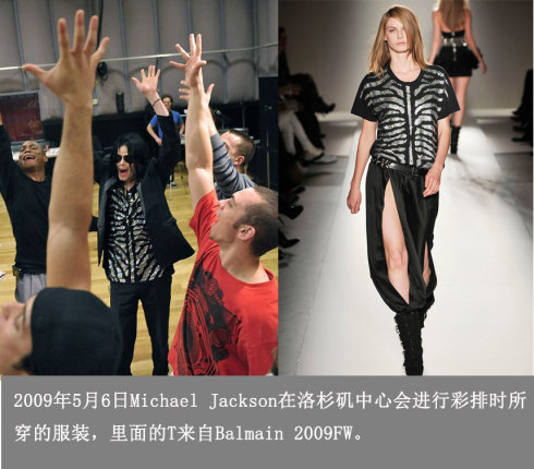 2009年5月6日Michael Jackson在洛杉矶中心为之后的伦敦演唱会进行彩排时所穿的服装,里面的T来自Balmain 2009FW。