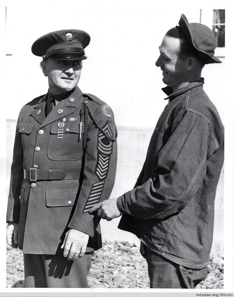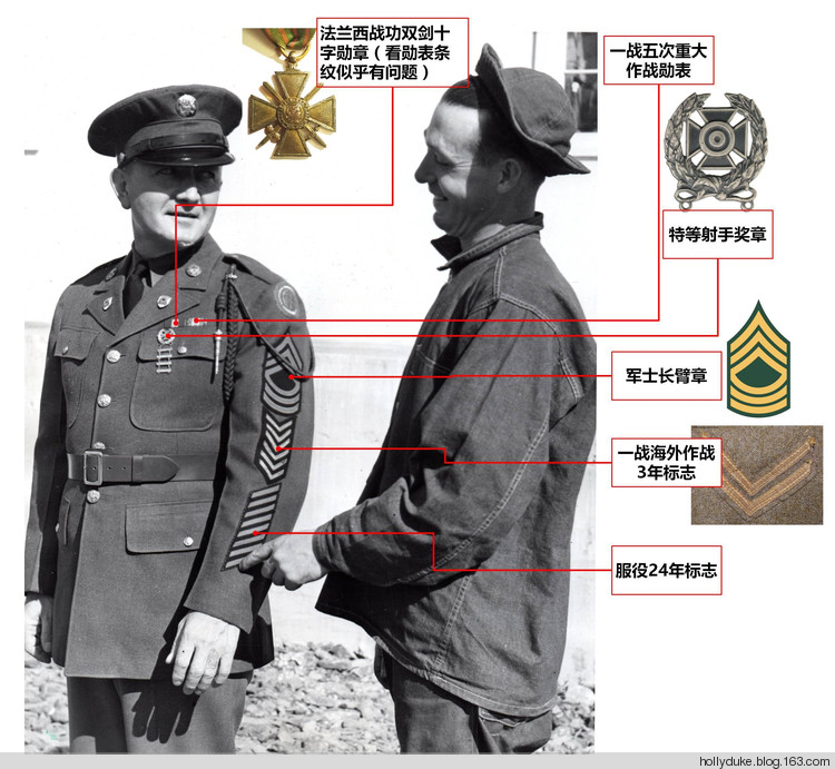1941年3月25日,美国陆军第35步兵师通信连教官哈兰德?托马斯拍下了这张照片。托马斯是当时美国最为著名的军士长之一,也是当时资历最为丰富的军士(有之一,不过这个范围很小了)。如果不信,这张照片就是证明。照片上,托马斯正在向战友展示自己的荣誉标志:法兰西战功十字勋表、5次一战重要作战行动勋表、带4片橡叶的优秀射手奖章。乍看这张照片的人,眼球一定会紧盯托马斯的袖子——这里有引发密集恐惧症的一长串标志:从上到下依次为第35步兵师军士长等级标志;6个V形荣誉臂章表示他在一战期间海外服役三年;最下面的8条斜线标志表示在陆军服役24年。