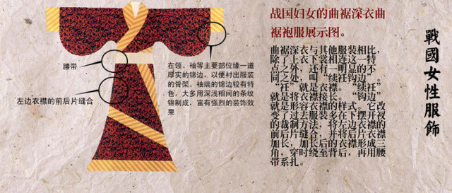春秋战国。春秋战国之际,出现了一种新式服装叫深衣。夏天穿的细麻布叫布衣,冬装有袍和裘袍是穿在里面的夹衣,内夹丝绵,充填些粗麻叫做湿袍,袍固就是内衣,短袍叫褥,质地粗劣的褥叫褐,裘是皮衣