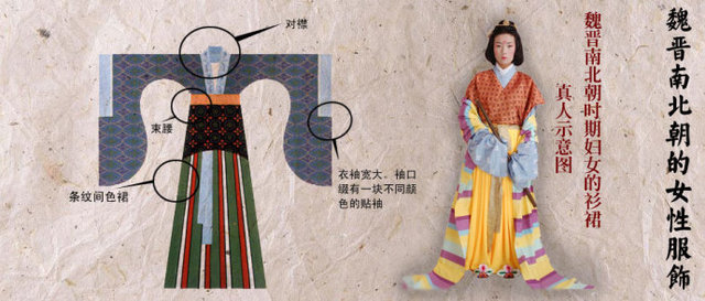 左衽、窄袖长袍仍可见到。一般女子时兴窄袖的衫襦、背子、长裙等。背子是明代贵族妇女的礼服之一,又称“披风”。