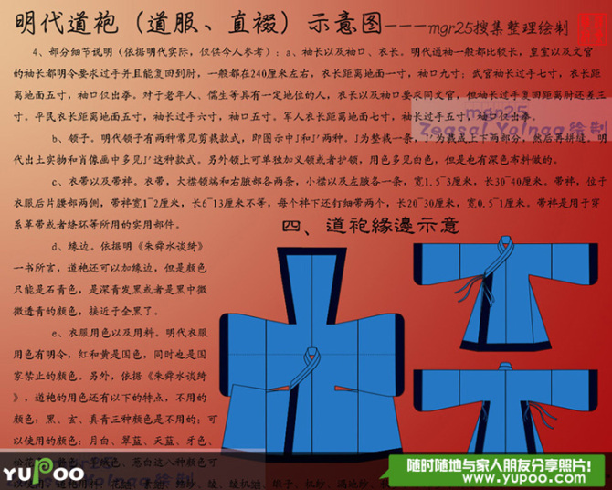 说具体一些。先以上衣为例。“幅的宽度只能作为衣物宽度方向使用”就意味着,通袖长2.4米的明式服装必须由4幅布料连缀,缝合出2.4米来,而不是把0.64米宽的布料裁出2.4米来作为通袖长,也就是说,衣身上布幅间的接缝必须是纵向的。比如下图的道袍。