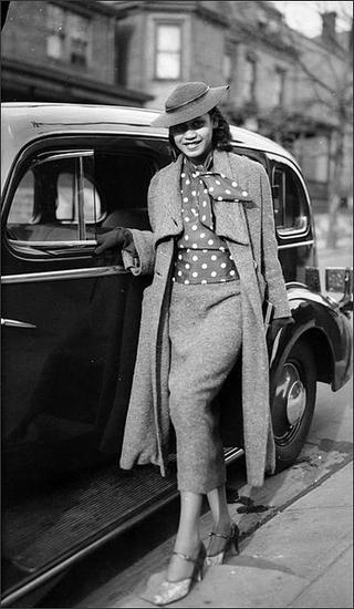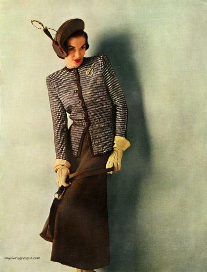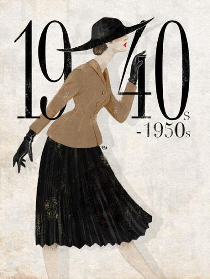 受到二战时期物资匮乏的影响,40年代初期欧洲民众的服装用料减至最低限度,一切非必需的装饰也被除去,同时简洁、硬朗的军装轮廓也影响倒女士日装,宽肩、收腰、窄身的二战风格套装成为当时的主流日装。