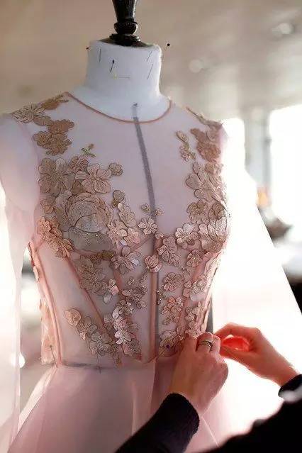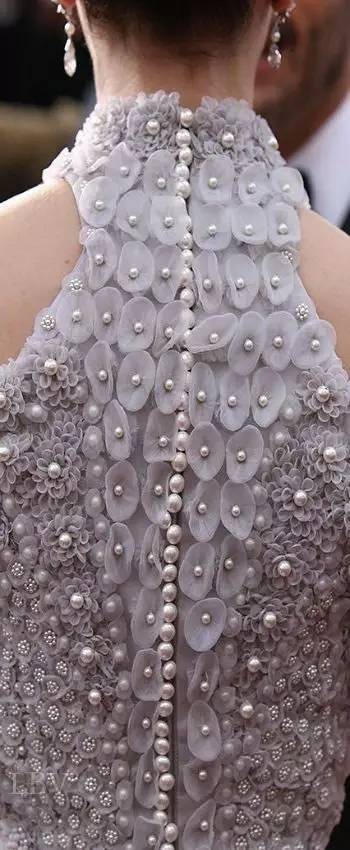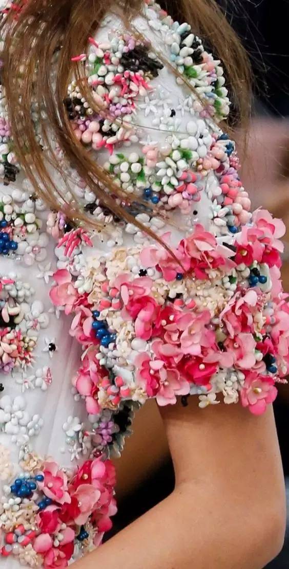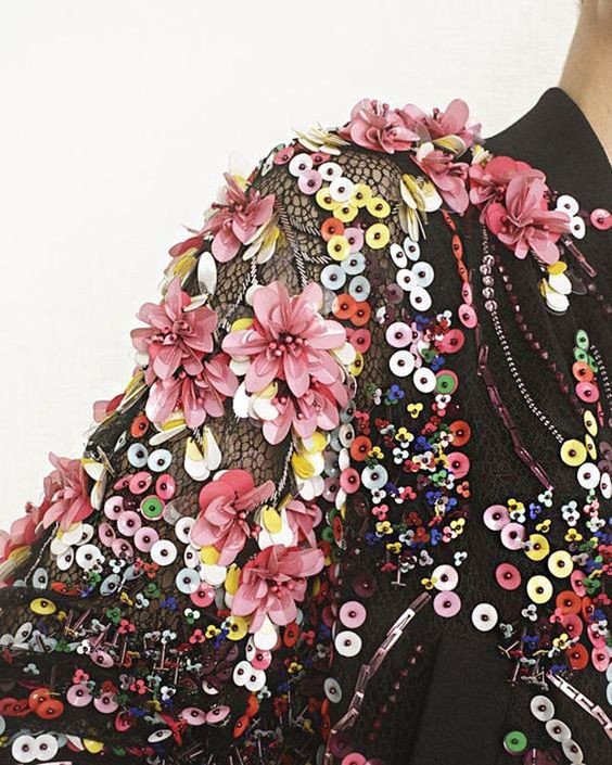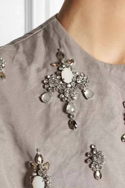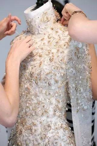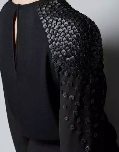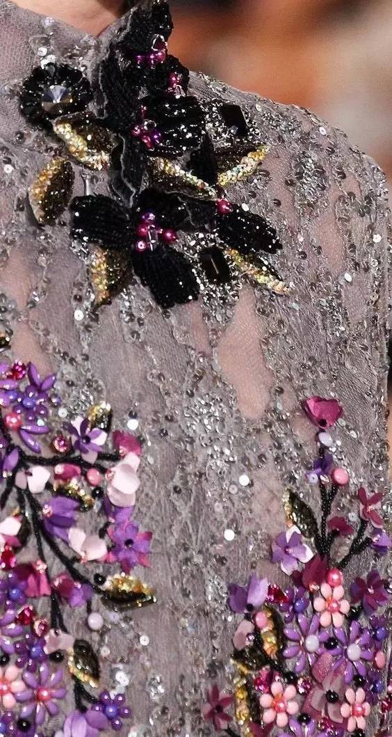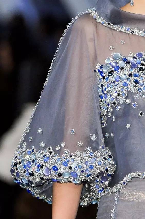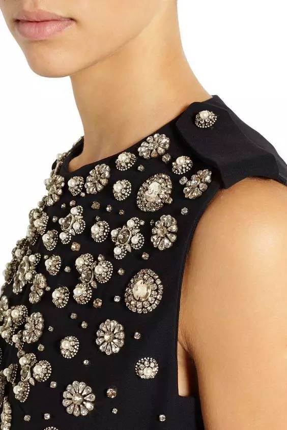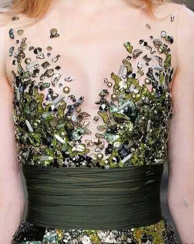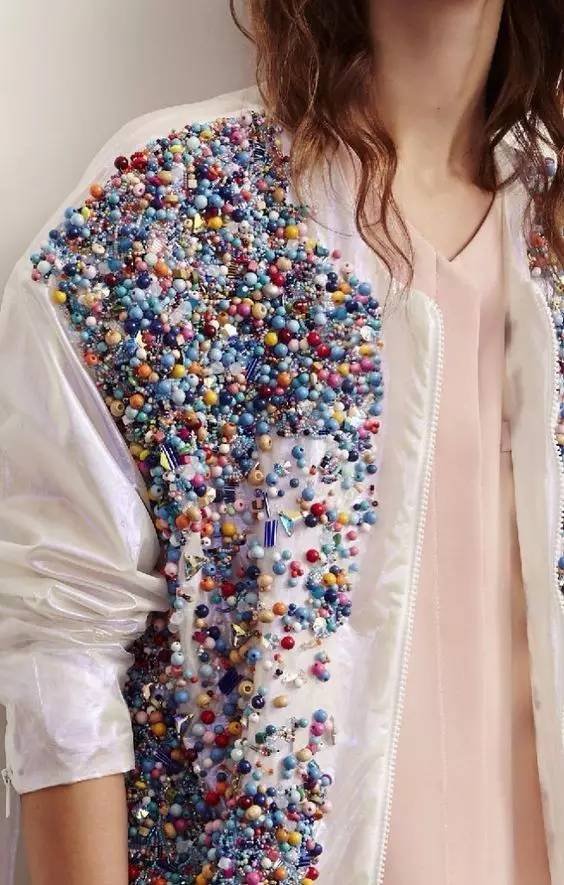 是在面料凹凸肌理的缝隙中嵌入珠子或闪光亮片进行装饰的刺绣。在已具有空间感和层次感的面料肌理以及有一定层次变化的面料中,嵌入珠子或闪光亮片,丰富了面料的肌理变化。在没有层次感的面料肌理中进行镶嵌,巧妙地处理了面料之间的拼缝装饰,增强了肌理感。