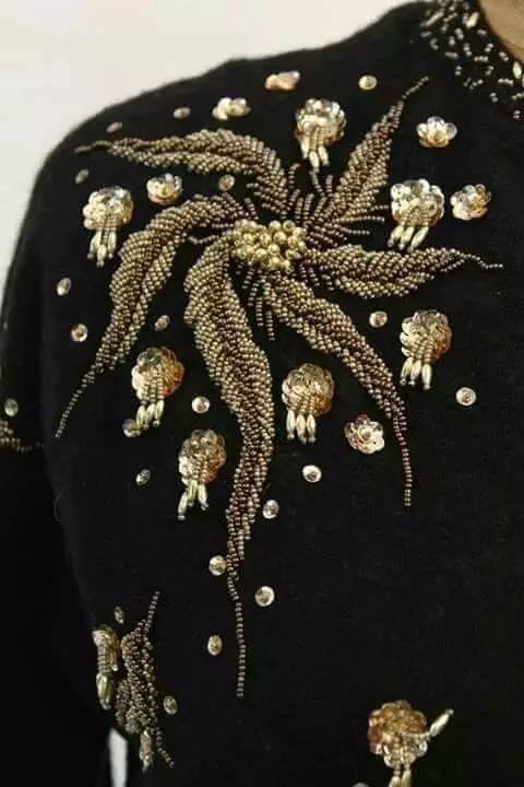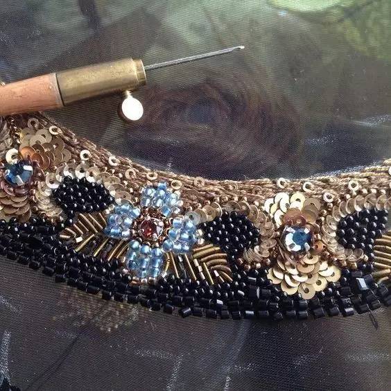 珠绣是在刺绣的基础上发展而来的,是用针穿引珍珠、玻璃珠、宝石珠等在纺织品上组成图案的刺绣。