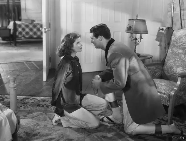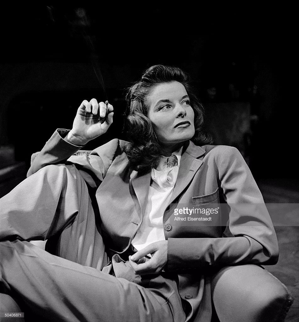 风格解读:在这部电影之前,电影中还没有穿裤子的女人。当时,电影公司的老板要求女主角凯瑟琳·赫本穿裙子,但凯瑟琳倔强地穿着内衣在片场走来走去,以示自己不适合任何裙装。不得已,电影公司的人只好把裤子还给凯瑟琳。从那之后,穿裤装的阳刚形象配合一头妩媚的推波卷的造型就成为凯瑟琳的标志性风格。