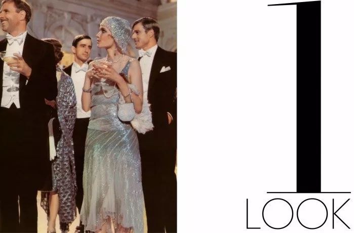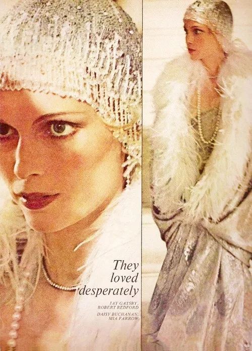 风格解读:米娅·法罗的乳白色连衣裙,长串珠、宽檐帽、用发卷夹起来的短发。雷德福穿的Ralph Lauren设计的三款西服、帽子和手套都成为不可超越的经典。