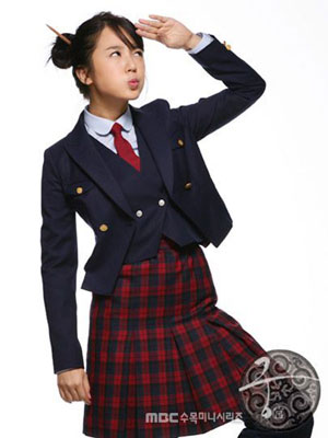 尹恩惠(윤은혜):蓝色西服里面套有可爱的小马甲(조끼),格子的百褶裙(주름치마),有股苏格兰(스코틀랜드)风格。