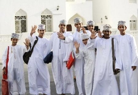 阿曼,校服具有很强的民族特色,一般男生穿着传统的长袍,女生戴着纱巾。