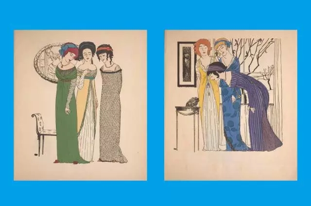 Paul Poiret邀请插画师,为自己的系列创作了两辑画册,画册具有新古典主义风格。他使用一种彩色印刷方式,提高了画面色彩饱和度。