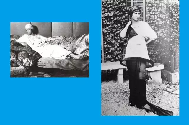 Poiret推出了一系列穆斯林风格服装,效果惊人。其中最雄心勃勃的一款设计,莫过于灵活自如的土耳其灯笼裤,多褶的裤子在脚踝处收紧,结合西方的紧身腰带,与边缘如伞状的灯罩裙搭配穿着,有着上世纪的女权产物bloomers的影子。