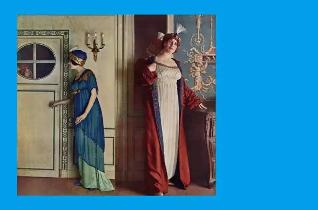 Poiret推出了Directoire line。这是一种简单而独创性的设计,裙子由丝缎制成,外面套上有刺绣装饰的薄纱罩衫,腰线升高至胸部以下,面料重心转移到肩部,裙摆直直下垂,坠地不过几厘米,极为轻盈方便。