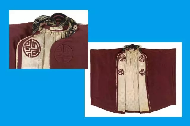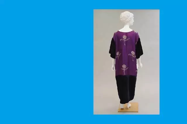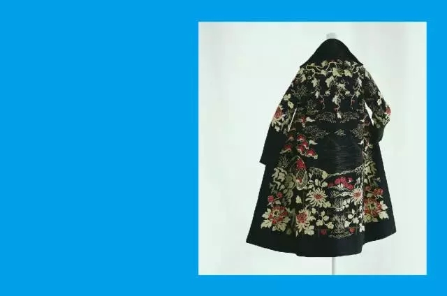 吸收日本和服样式的长袍,用宽大低垂的和服袖替代西方的窄袖,丝绸面料上装饰以刺绣图案,后背形成经典的日式垂肩三角轮廓,既含蓄又优雅。