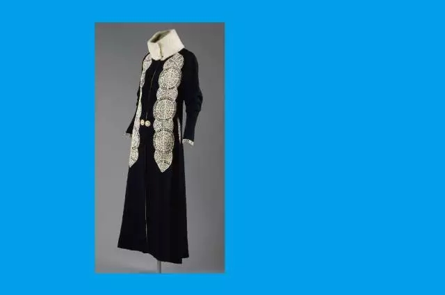 1923年,Poiret推出了名为“Mandarin“翼领外套。黑色斜纹羊毛上布满柏瓦刺绣。精美的链形缝法,生动地描绘了菊花、鸟、波浪、松树、祥云等典型的中式装饰图样,美不胜收。