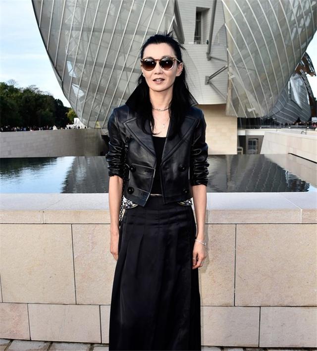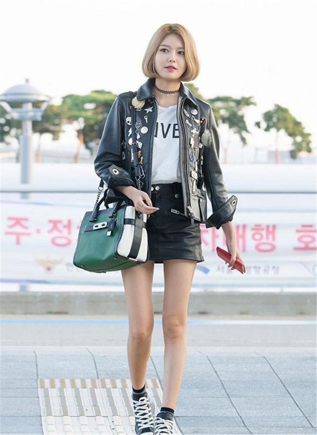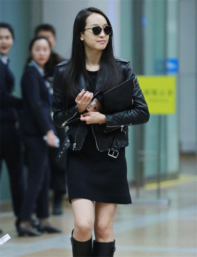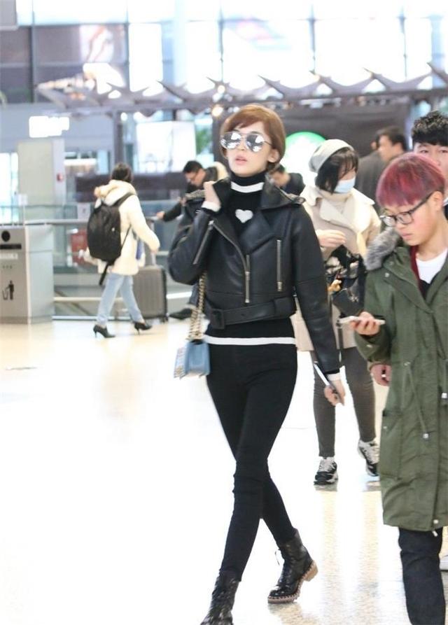 黑色皮夹克皮靴,搭配黑牛仔裤、淡蓝色包包,加之一头短发,显得分外帅气干练。