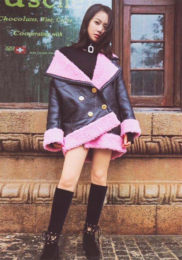 皮衣拼接粉色羊毛羔外套,内搭黑色毛衣打底,保暖又舒适。下身“失踪”法的穿搭,更显潮流韵味。