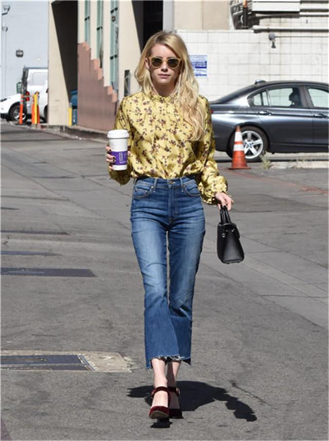 喇叭牛仔裤会更显成熟,宽松的喇叭裤腿让你的不够完美的双腿隐形于裤腿当中。脚踩一双尖头高跟鞋,让你拥有大长腿不再是梦。