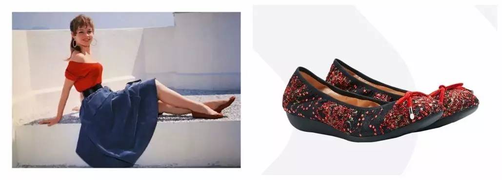在成为风靡全球的性感“小野猫”之前,法国国宝级女星BrigitteBardot是一位训练有素的芭蕾舞者。那时的她已经是Repetto芭蕾平底鞋的忠实喜爱者。1956年,她请RossRepetto为她设计一双红色芭蕾舞鞋,并在电影《上帝创造女人》中多次穿着这双鞋,这部电影后来成为经典,而这双红鞋随后也被称为法国版灰姑娘的红色水晶鞋,它不仅帮助Brigitte塑造了小猫般顽皮可爱的少女形象,也成为轻便、舒适、性感的象征。从此Repetto的芭蕾舞鞋也成为经典鞋款,令全世界的女性趋之若鹜。