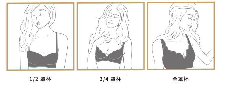 内衣罩杯主要分为全罩杯、3/4罩杯、1/2罩杯。