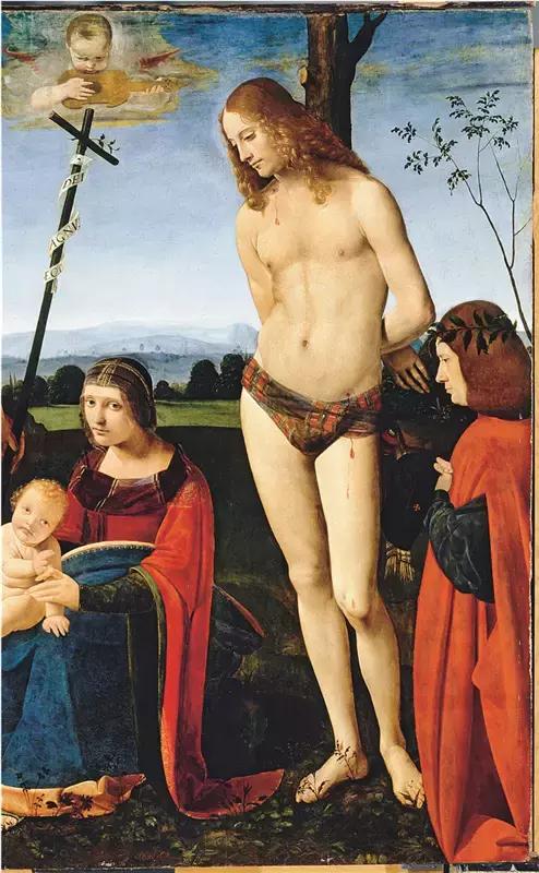 画作中这三个年轻的女性,一个在弹鲁特琴,一个在弹竖琴,体态优雅,令人赏心悦目。中间的那位女性几乎什么都没穿,只穿着类似于我们今天说的“丁字裤”一样的内裤,“丁字裤”上还装饰着一条有圆头饰钉的漂亮腰带。