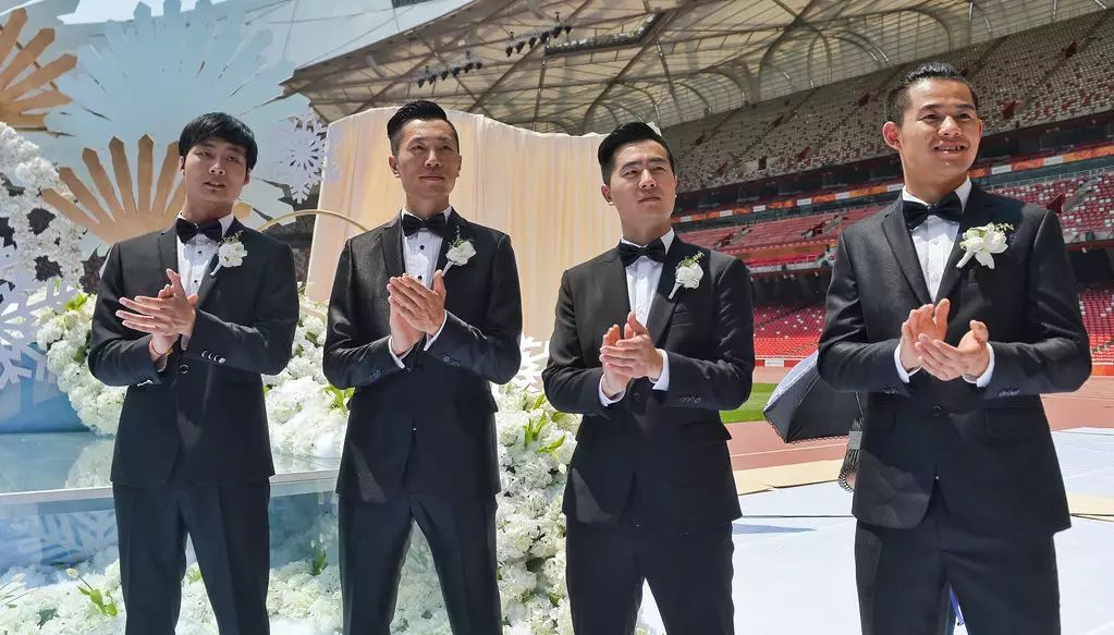 右边第一个人放错了,一般是粘或别针固定,原版正宗应该是插在花眼中、用花袢固定的,而胸部的兜只能放方巾。