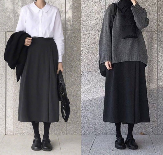 右边款式:深灰色毛衣是我比较喜欢的款式,半身裙还是学院风,鞋子都是一款。