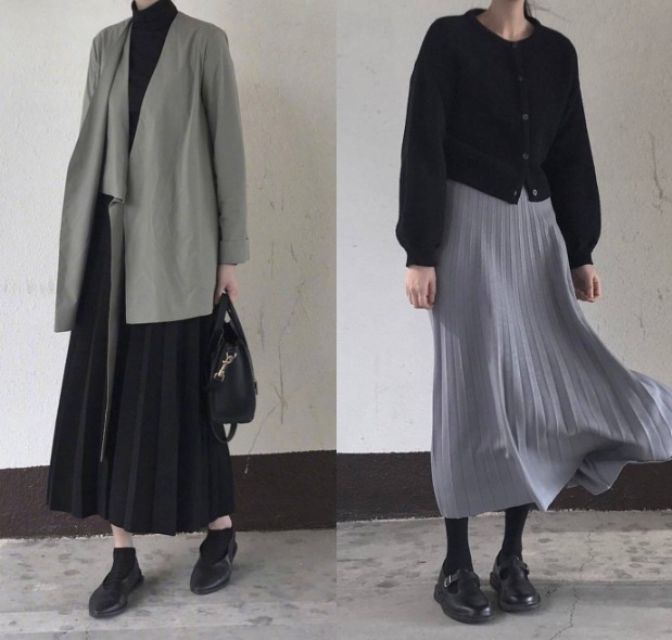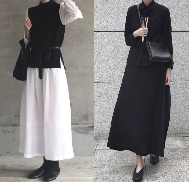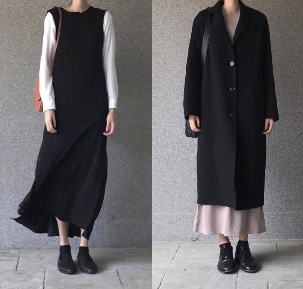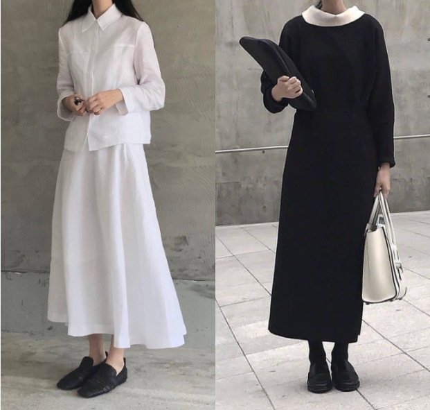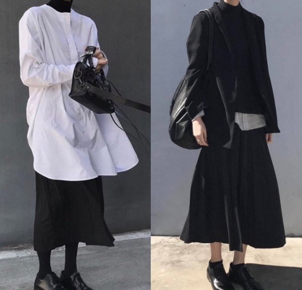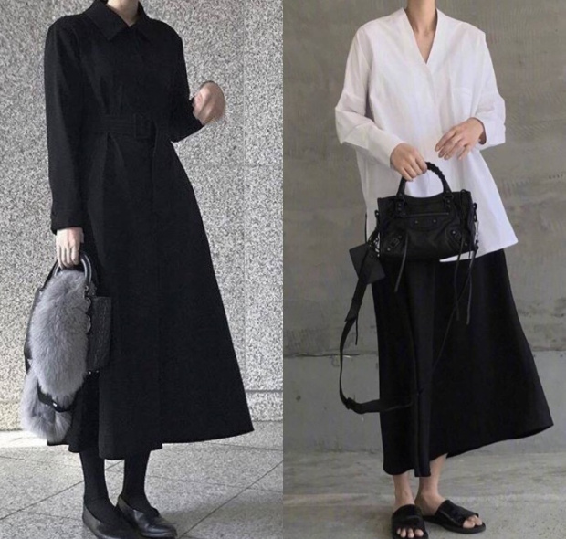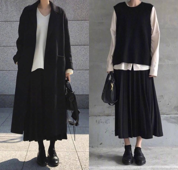 左边的黑色风衣是不是很显酷;右边的白色和黑色裙的搭配,是那种韩电影里的知性姐姐的标准搭配。