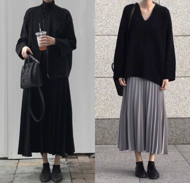 毛衣和百褶裙的搭配,这两身都很好看。冬天可以在外面搭配毛呢、羽绒服,这样在室内可以脱掉外套,内搭就显得很惊艳。