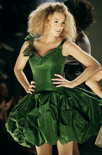 这是在布莱尔老妈的时装秀上,临时客串模特的S,沁心的绿大牌超有型的扎发!怪不得引得在场的上东区名流们连声喝彩呢!如此清新可人的姑娘女的看到都会心动吧!