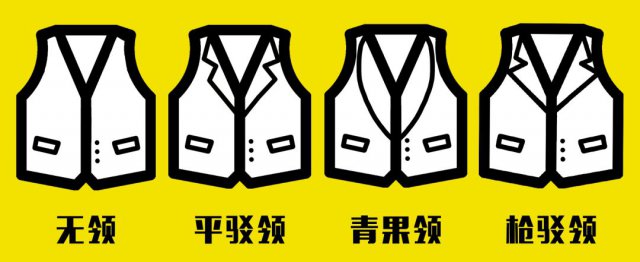 马甲从领型上分最常见的是:无领、平驳领、青果领、还有枪驳领。