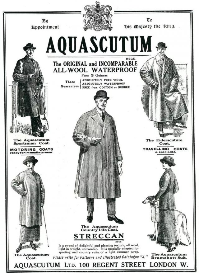 Aquascutum 在拉丁语里是 " 防水物 " 的意思,所以顾名思义,它家的风衣是以防水性为佳。Aquascutum 最先采用的防水羊毛面料,而到了如今则开发除了尼龙和混合棉织成的面料,不仅防水,还能抵抗时速达到上百公里的大风。