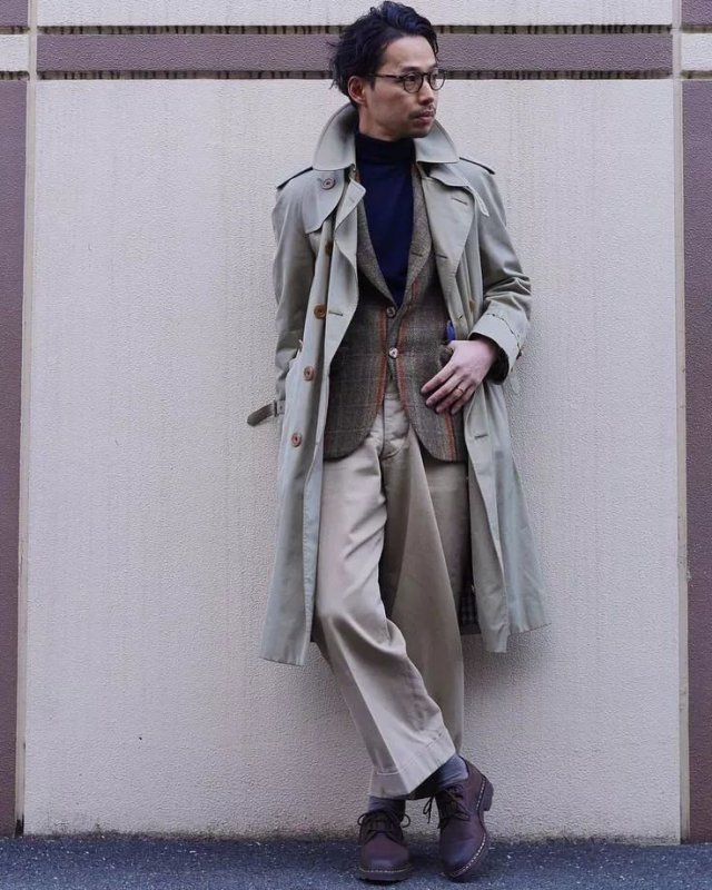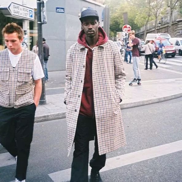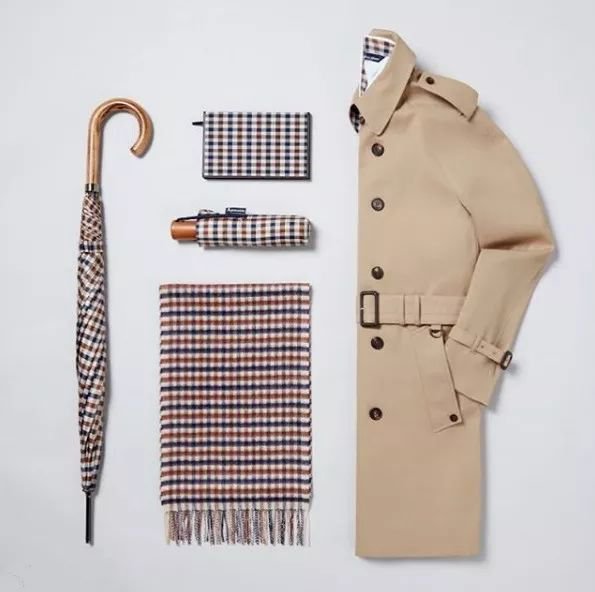 值得一说也是比较有特色的是,Aquascutum 的格子内衬是风衣品牌中最早的,是 杏色 + 蓝色 + 酒红 三色交织的苏格兰格子。这一格子看起来非常有活力感,对于年轻人来说也比较合适。