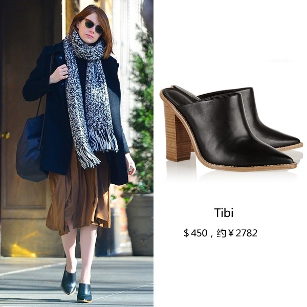 Emma Stone选择最为经典的黑色穆勒鞋搭配裙装,尖头的款式更能有效拉长腿部线条。