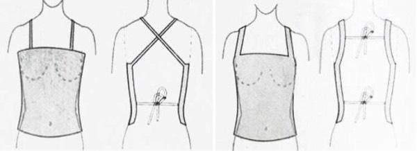 “抹胸”穿着后“上可覆乳,下可遮肚”,整个胸腹全被掩住,因而又称“抹肚”。用纽扣或带子系结。
