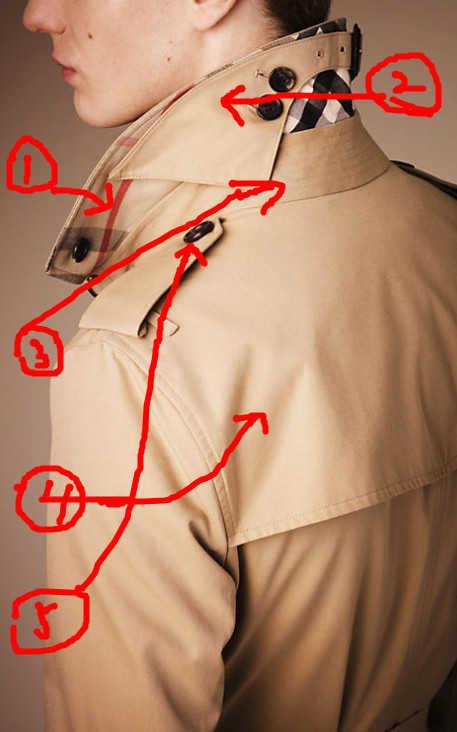 (1):Under collar check: Heritage 系列的风衣领子下面都有Burberry经典的黑白红格纹。London系列下也会出现类似但是通常是黑灰色的格纹(装深沉),Prosum系列通常会尽力避免任何格纹(保持逼格),Brit系列随机出现各种格纹(low b)。