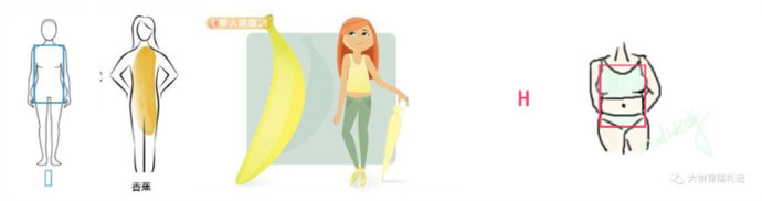 H型身材,又称香蕉形身材也有称矩形身材,上中下等宽,介于X和O之间,特点:胸部、腰部、臀部围度差较小。