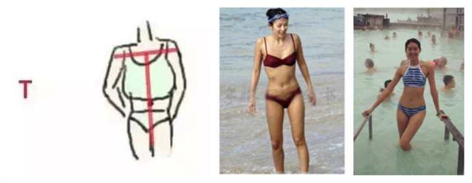T形身材通常呈现I型身材的平胸无腰窄臀的性质,但是特点在于肩宽。所以这特点适用于各种肩宽的mm。