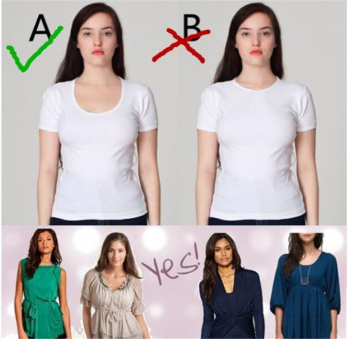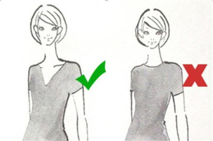 U领、必须是比较大的U领:这里注意的是,U型领不是圆领。U型领比圆领要更深。深而长的U型领使锁骨及胸部以上的肌肤裸露,可以让颈部看上去修长,而肩部也自然就看起来变窄了。