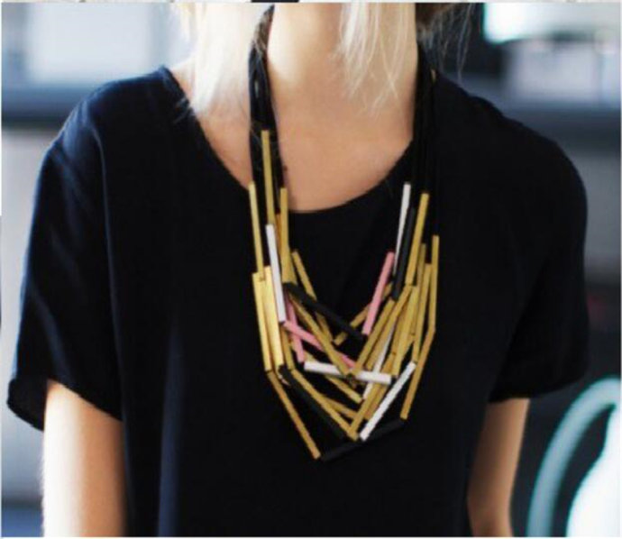 同样的道理,宽肩姑娘,当你的衣领过高过压抑时,佩戴一条别致夺目的长项链,也能起到收拢视觉重心的作用!从而弱化肩部轮廓。如下面的图片中,自然下垂的金属项链很抢眼,弱化了T恤本身的领口位置,所以视感就会以项链的垂度作为视觉重心。