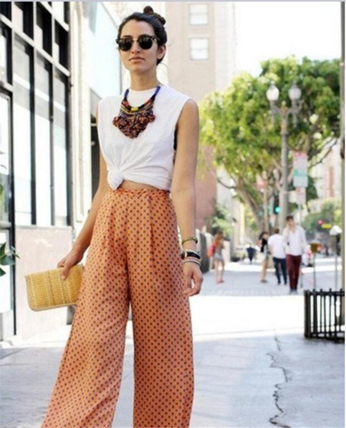 也可以穿阔腿裤、甩腿裤、有口袋装饰的工装裤、花色大图案的裤子。这可以帮助草莓型身材增加下半身的宽度,从而平衡整体体型。