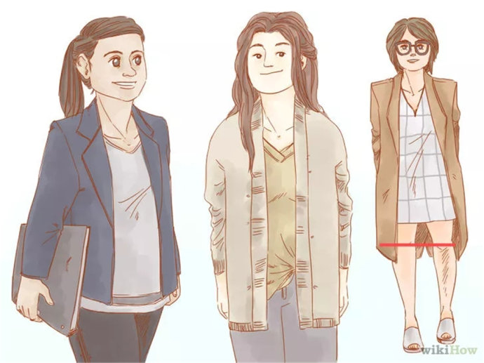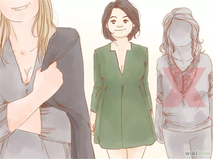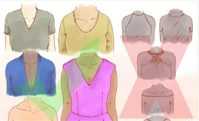 避免:颈部系带、高领、领子部位有很多装饰物、露肩或者船型领的上衣。这会使你的肩部看起来更宽,吸引注意力到你的胸部。