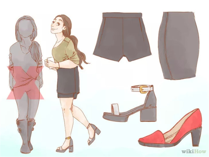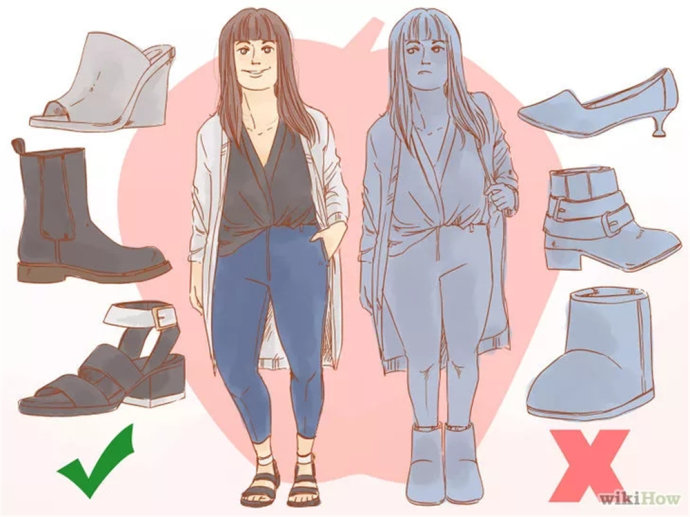 避免穿的:中跟鞋、带扣靴、雪地靴或者其他可能使你的脚看起来太大的鞋子。这些鞋子会反过来使你的腿部看起来更细,吸引更多的注意力到你的腰部。