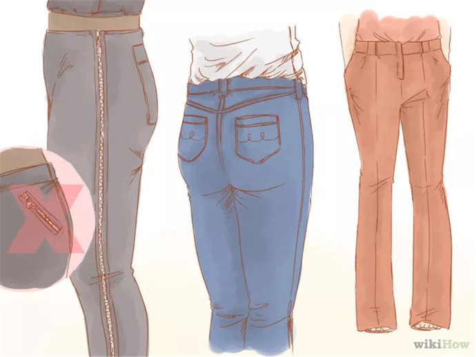 穿有后口袋的裤子。这会使你的臀部看起来胖一点,来平衡掉你胖胖的腰部。