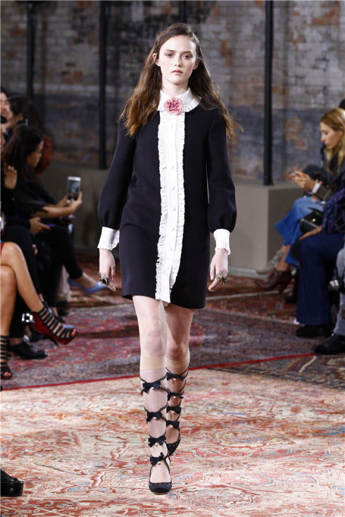 黑白双色连衣裙(淡粉色鲜花绽放)+蝴蝶结式样罗马鞋,连衣裙裙底黑色,只在袖口、衣领和纽扣两边做了撞色流苏设计,袖口是宫廷风的感觉,处处都是少女风。