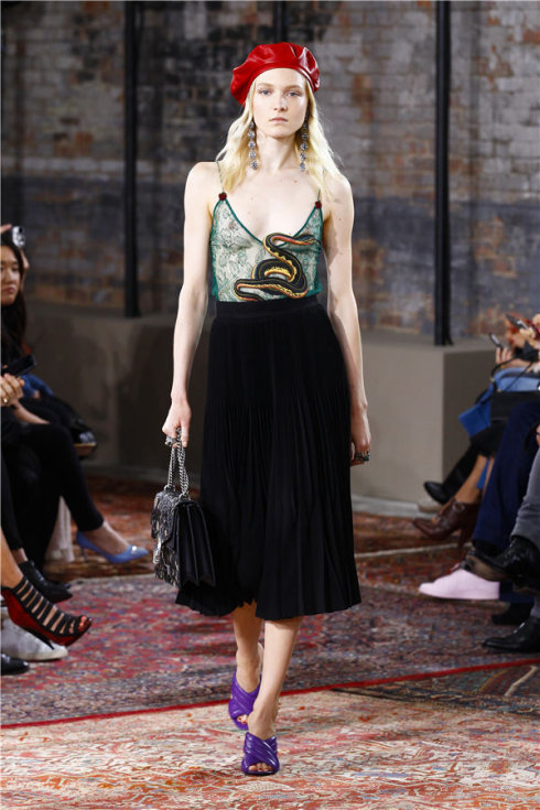 蛇嗅到了性感忍不住爬上来了!墨绿蕾丝+黑色呢质长裙+红色皮质画家帽+黑色公文链条包+紫色拖鞋。绿紫红,挺和谐。