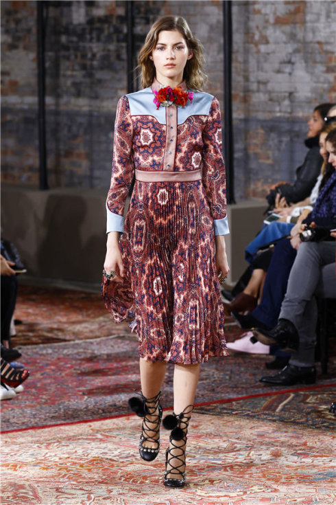 地毯式印花连身裙+黑色带球罗马鞋,肩膀处和袖口淡蓝色的拼接让整片地毯红冷静下来。