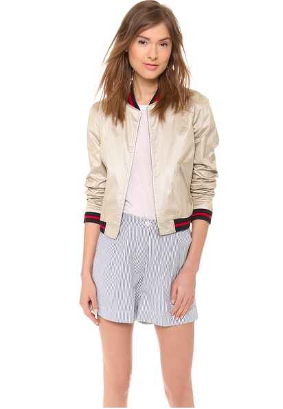 比较流行的夹克材质莫过于金属色的,尤其在沉闷的秋冬季节更能点亮搭配。选择一件廓形的轻薄金属短夹克,在初夏季节也可以用来搭配。