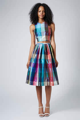 亮色的格子上衣配上格子裙,金属质感蔓延到全身,非常特别亮眼。