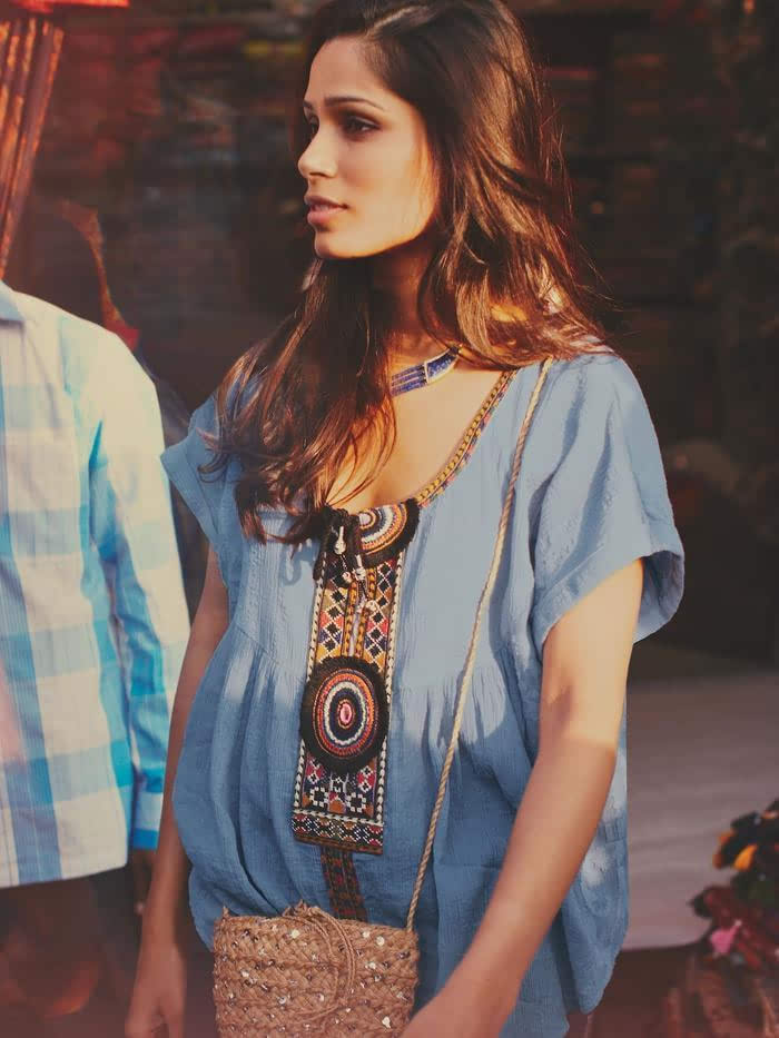 Free people 浅蓝色,民族风格纹理,宽松款低胸上衣,简单的民族元素为夏日和浅蓝的色彩为夏日增添了一丝清凉。