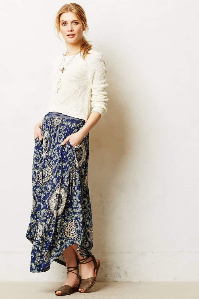 深蓝色调的半身裙不禁让人想到乍然的少数民族风格,但这款长裙并不是乍然的工艺,精致的花纹。