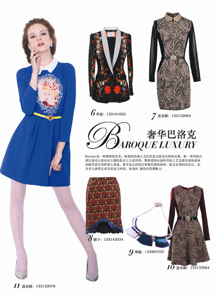 Baroque是一种激情的艺术,浓郁的浪漫主义色彩是巴洛克风格的灵魂。新一季的欧点将巴洛克元素在此主题的款式上大放异彩,散落着的水晶和亮钻工艺及极具装饰意味的细节设计同样使人着迷。奢华复古的设计和现代感的面料,配以衣领间的宝石,在本季上演着巴洛克的复古时尚,展现OU.独特的优雅魅力。